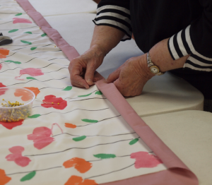 The quilts are made from bed sheets and surplus material. Materials are held together by knots rather than quilting stitches. Simple sewing skills are all that’s required: tie a knot, thread a needle, cut fabric, pinning, or using a sewing machine.